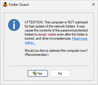 Note that if another user is using your computer while the reminder message is displayed, the user can click on the message and that would disable the protection performed by Folder Guard. To prevent other users from being able to access your protected files and folders, you must purchase a license for the continued use before the expiration of your evaluation period.