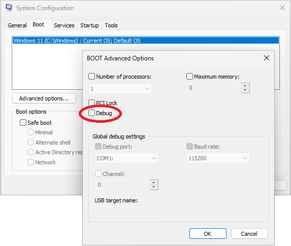 Restart the computer, and the Test mode message should disappear from the corner of the desktop. If you still see the Test mode message in the corner, it could be that you have the debugging mode enabled. To disable it, run System Configuration tool of Windows, select the Boot tab, press Advanced options, and finally make sure the Debug box is cleared:
