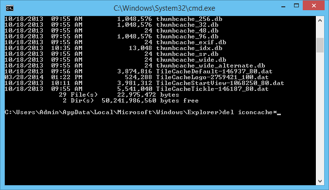(In case you are wondering, the star character after iconcache is necessary to make sure all files with names that start with iconcache will be included in the delete operation.) That should delete all the icon cache files. You can use the dir command again to check the list of files remaining; if there is still one or more of the iconcache files listed, it means that you either did not enter the command correctly, or some program is still using the icon cache.